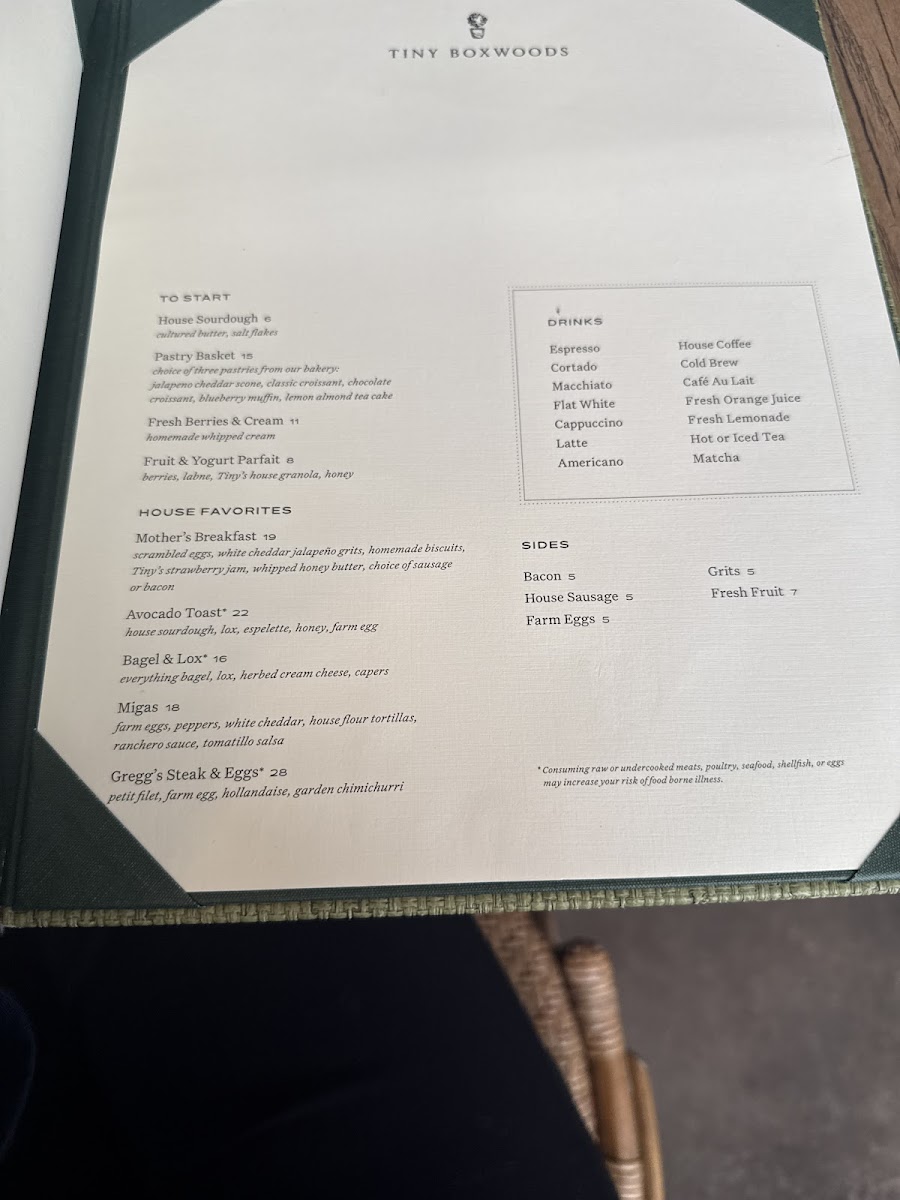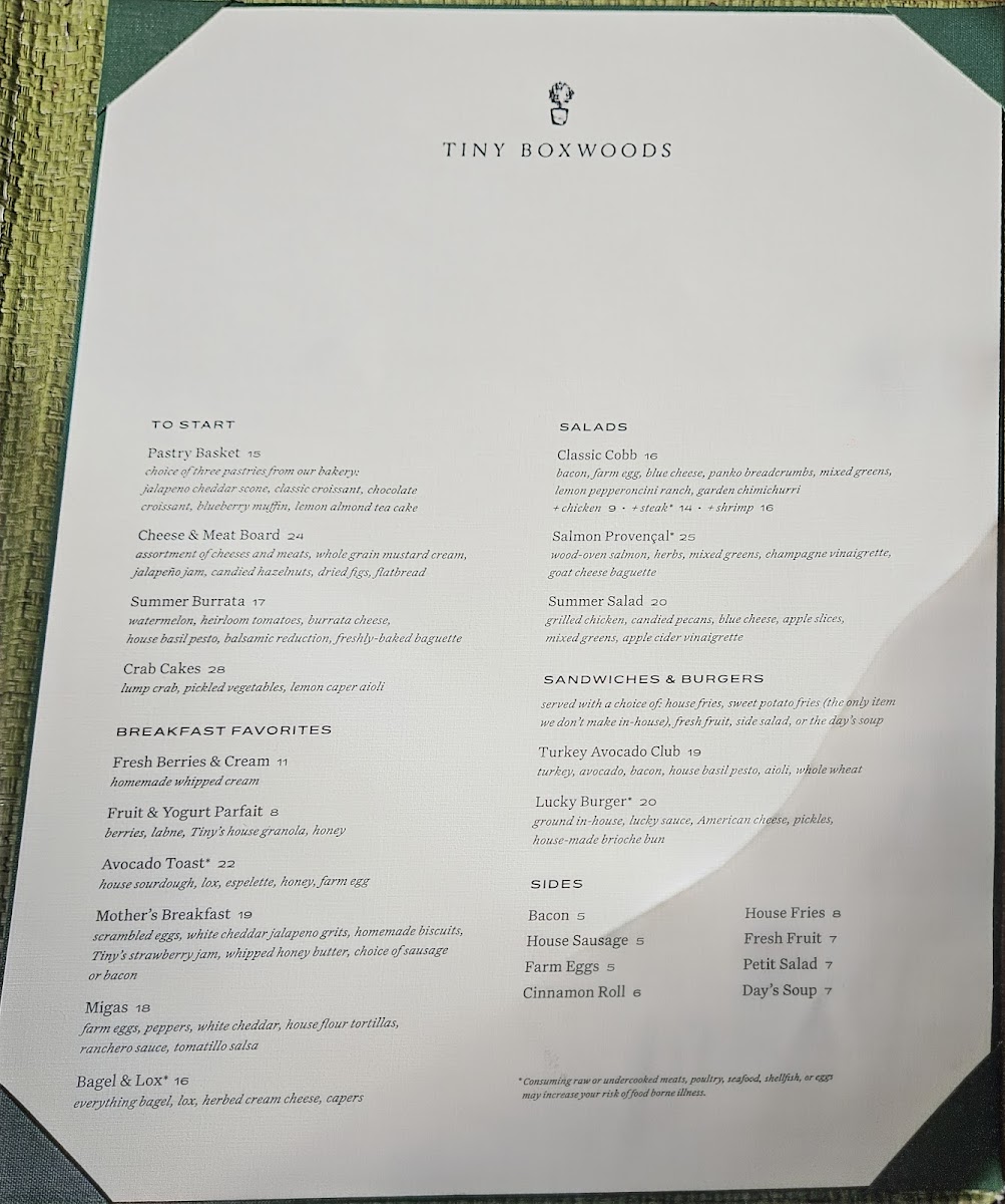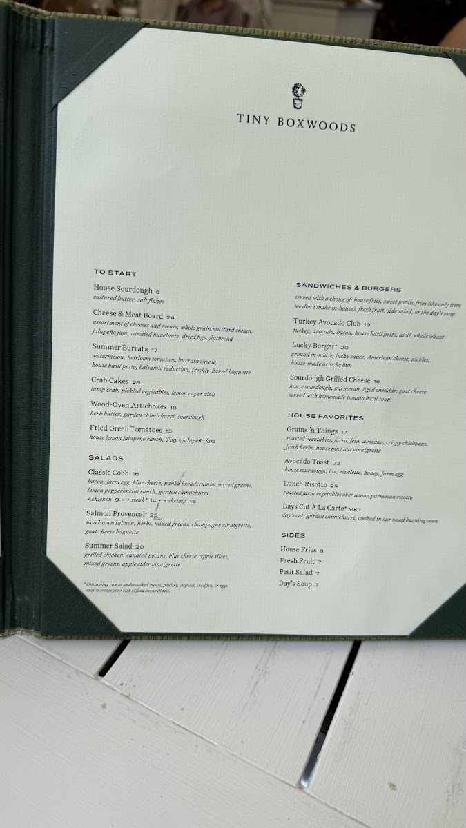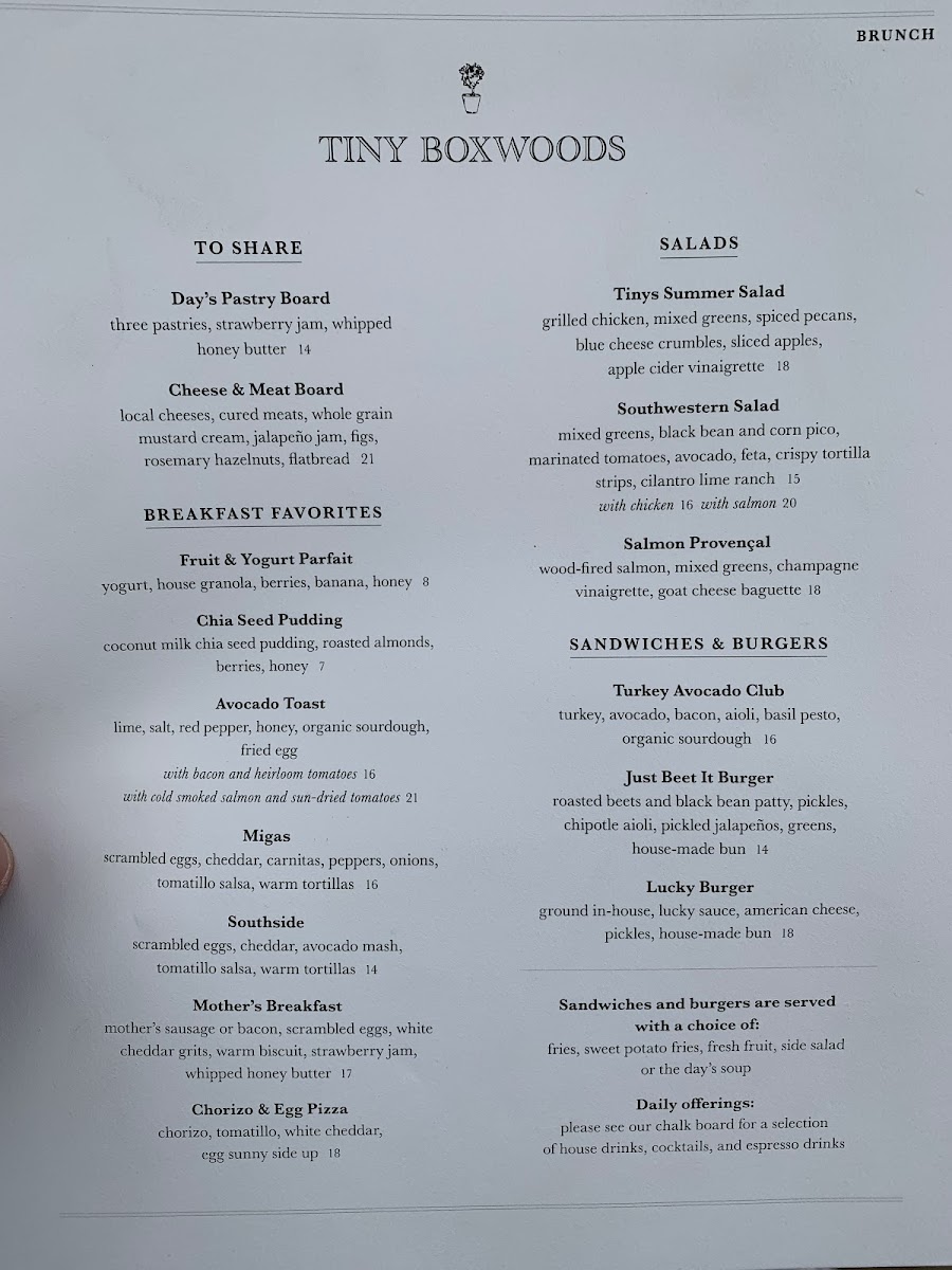 In sum, Tiny Boxwoods isn't just a restaurant; it's an experience. From the first sip of coffee to the last bite of dessert, every moment here envelops you in a harmonious blend of taste and charm. Whether you're catching up with friends or enjoying a leisurely weekend brunch, this enchanting eatery invites you to make memories that linger long after you leave.